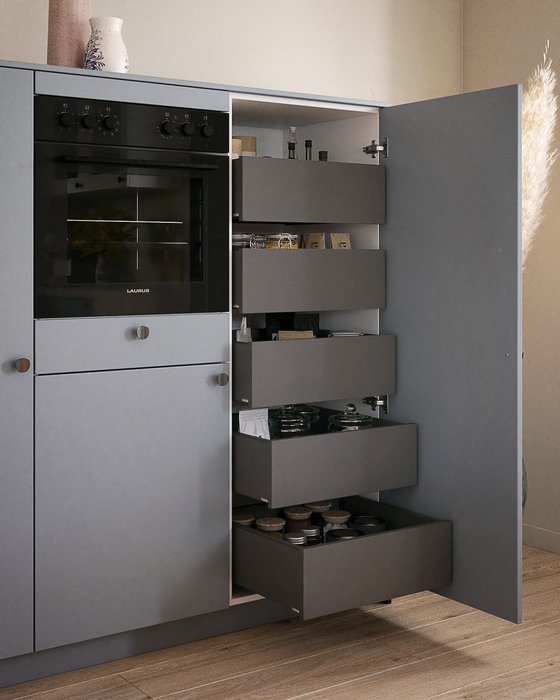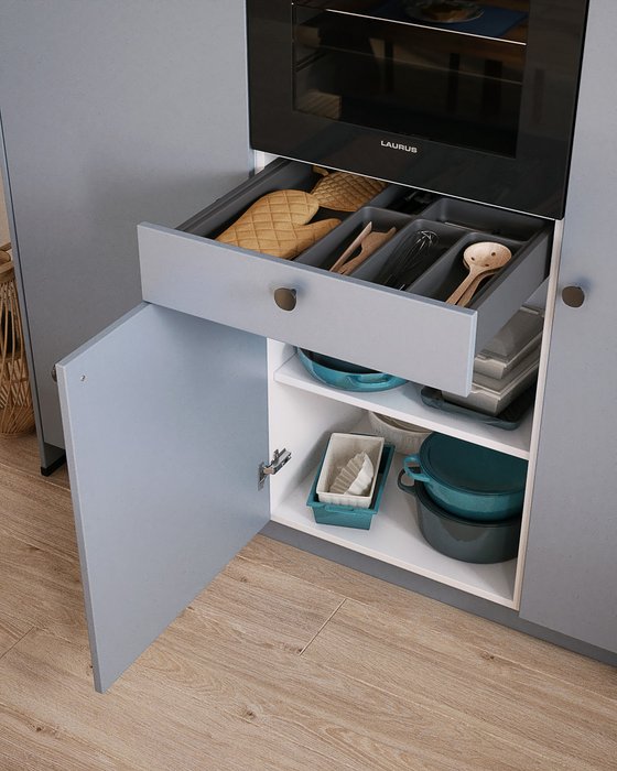 Chaque recoin trouve sa fonction : sous le four, un tiroir astucieux pour ranger vos ustensiles, complété par des étagères pour y ranger vos plats du quotidien. Pratique et esthétique, ce duo offre un espace fluide et organisé.