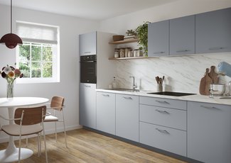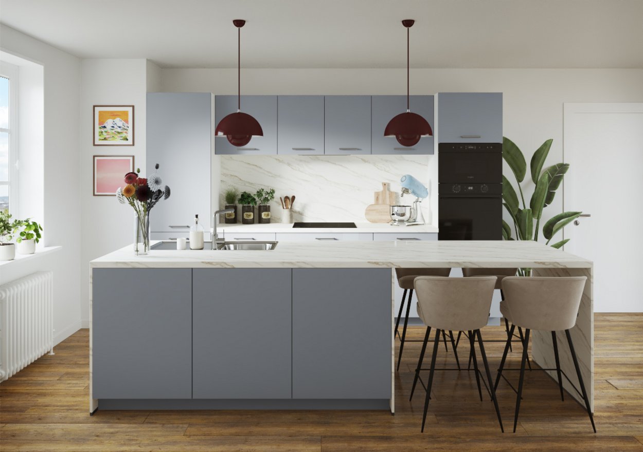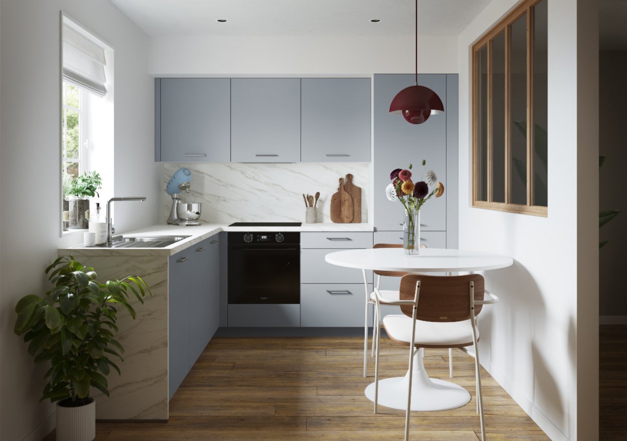 La cuisine Dolce Azur incarne bien plus qu’un simple espace de vie : c’est une invitation à ralentir, à savourer l’instant. Ses façades associent des portes lisses bleues, comme les reflets changeants de la mer, à des portes blanches à cadre, inspirées du charme des cottages. Le plan de travail en béton blanc évoque la douceur du sable. Un mélange de matières et de styles qui créent une atmosphère simple et apaisante, empreinte d’authenticité. Tout a été pensé pour recréer l’ambiance unique d’une maison de vacances : celle où l’on se sent libre, léger, où les repas se partagent en toute simplicité, entre rires, parfums iodés et lumière douce des fins d’après-midi. Dolce Azur, c’est la promesse d’un art de vivre sincère, d’un refuge cosy où chaque détail respire le calme et l’élégance discrète. Un lieu où le temps suspend sa course pour laisser place aux souvenirs.