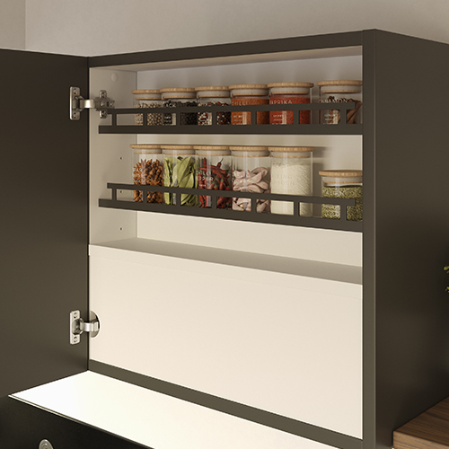 Le meuble hotte n’a pas fini de vous étonner : vous n’aurez qu’à ouvrir ses portes pour ranger vos épices préférées. Idéal pour gagner de la place et garder votre plan de travail propre et ordonné !