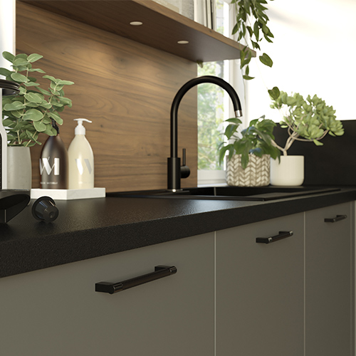 Assorti à l’évier, le plan de travail noir structuré achèvera de donner à cette cuisine un joli style contemporain.