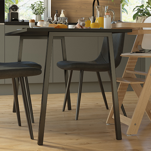 La table-plan de travail et les chaises design sont une véritable invitation à cuisiner, partager un repas et se réunir pour de beaux moments en famille.