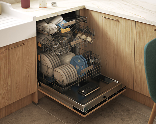 Intégré avec discrétion, le lave-vaisselle prend le relais après les repas animés pour une cuisine toujours nette, sans effort. Son tiroir supérieur accueille couverts et bols, libérant de la place dans les paniers inférieurs et optimisant chaque lavage.